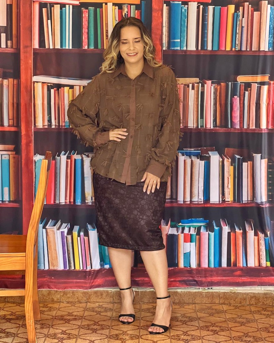 Camisa na viscose, toda bordada, ampla, com manga longa! modelagem oversise, super estilosa no marrom!