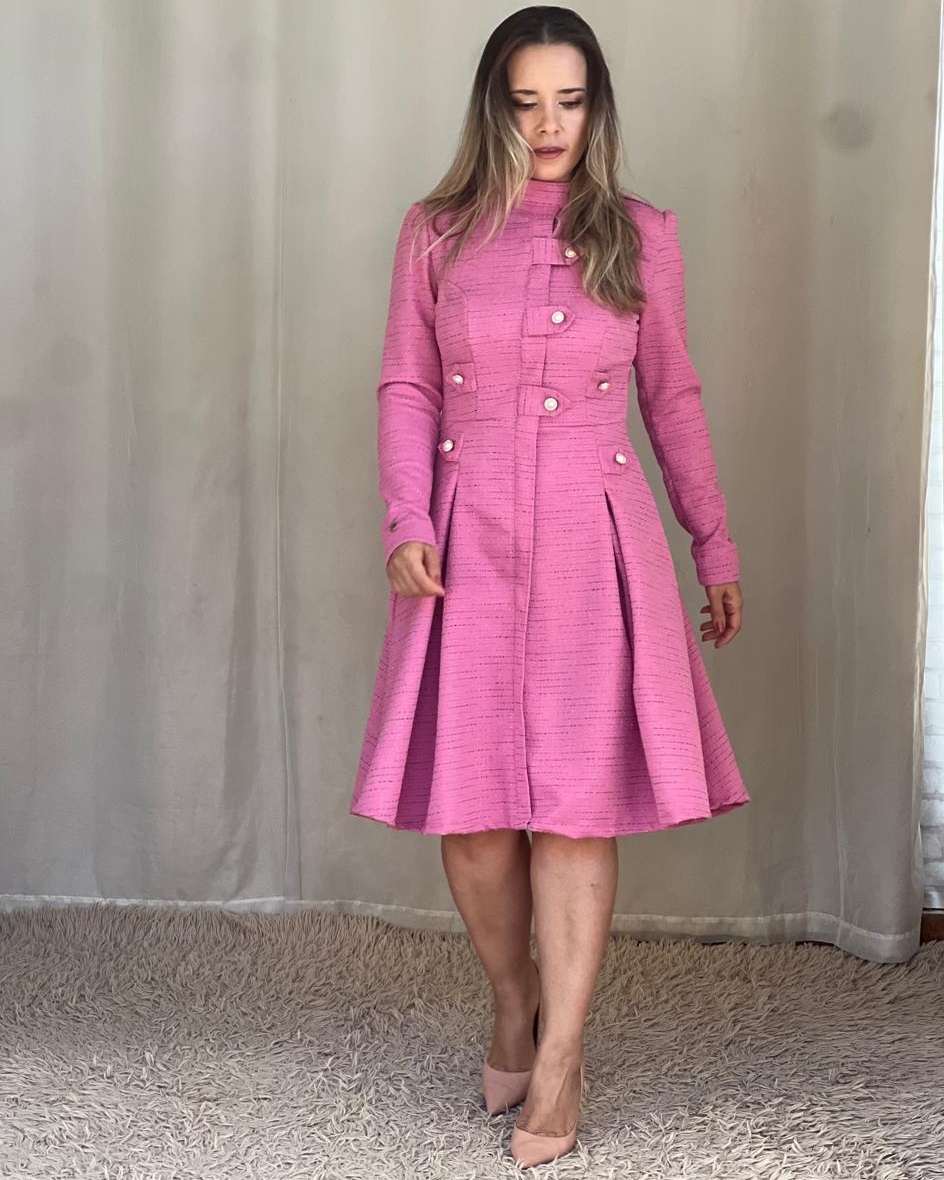 Vestido Andressa no tweed com bastante elastano, manga bufante longa, com abertura na gola pra passagem na hora de vestir, com botoes de perola preto e dourados, com tecido com fios de lurex e trabalhado, com prega macho na frente e nas costas trazendo volume e elegancia a peça! modelagem gode!VEstido poderoso!