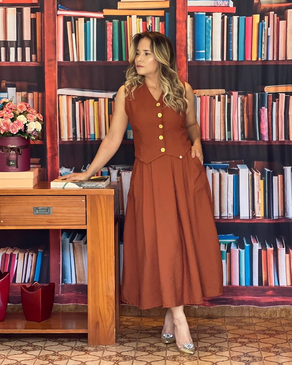 Saia Ana no alfaitaria premium midi com pregas na frente e nas costas, com ziper invizivel e bolsos nas laterais