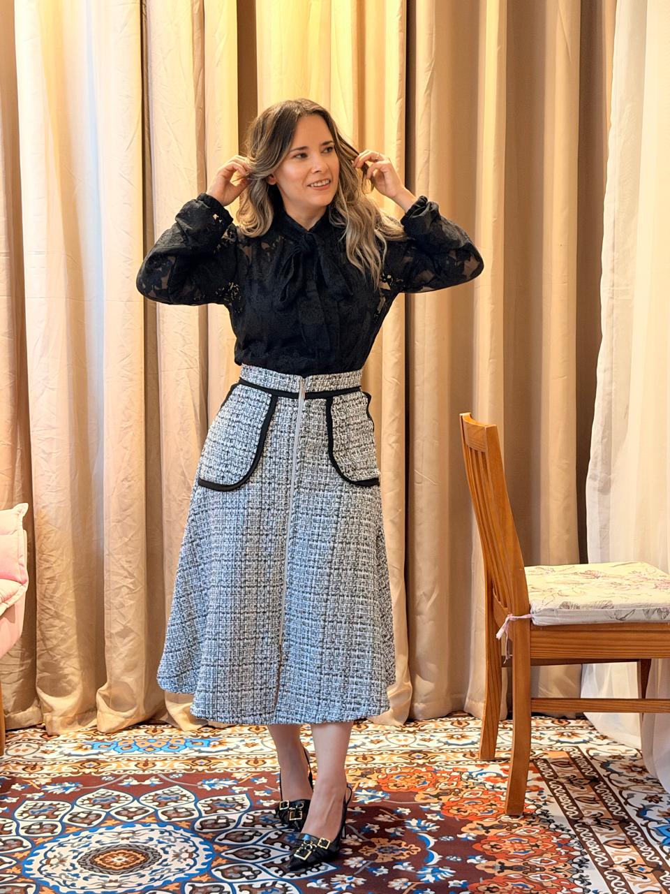 Saia CAssiane, no tweed com vivos pretos e ziper de encaixe na frente! Modelagem impecavel com corte em A trazendo movimente e volume na barra