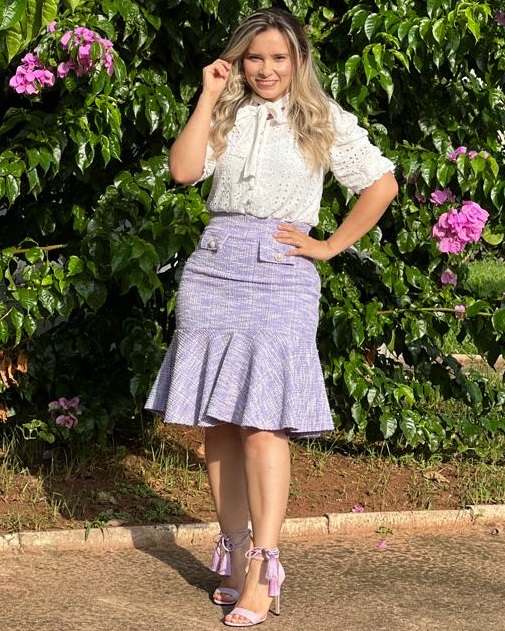 A Saia Mayara feita no tweed de malha com bastante elastano, com lapela de bolso na frente com botao!