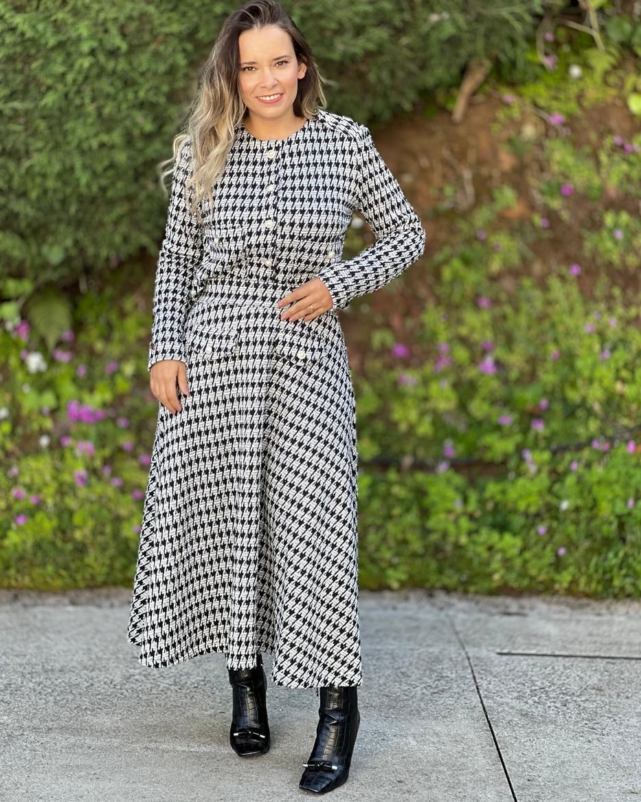 DESCRIÇÃO:Saia no tweed de malha com bastante elastano!Pregas na frente e nas costas e detalhe de lapela e botoes na frente!