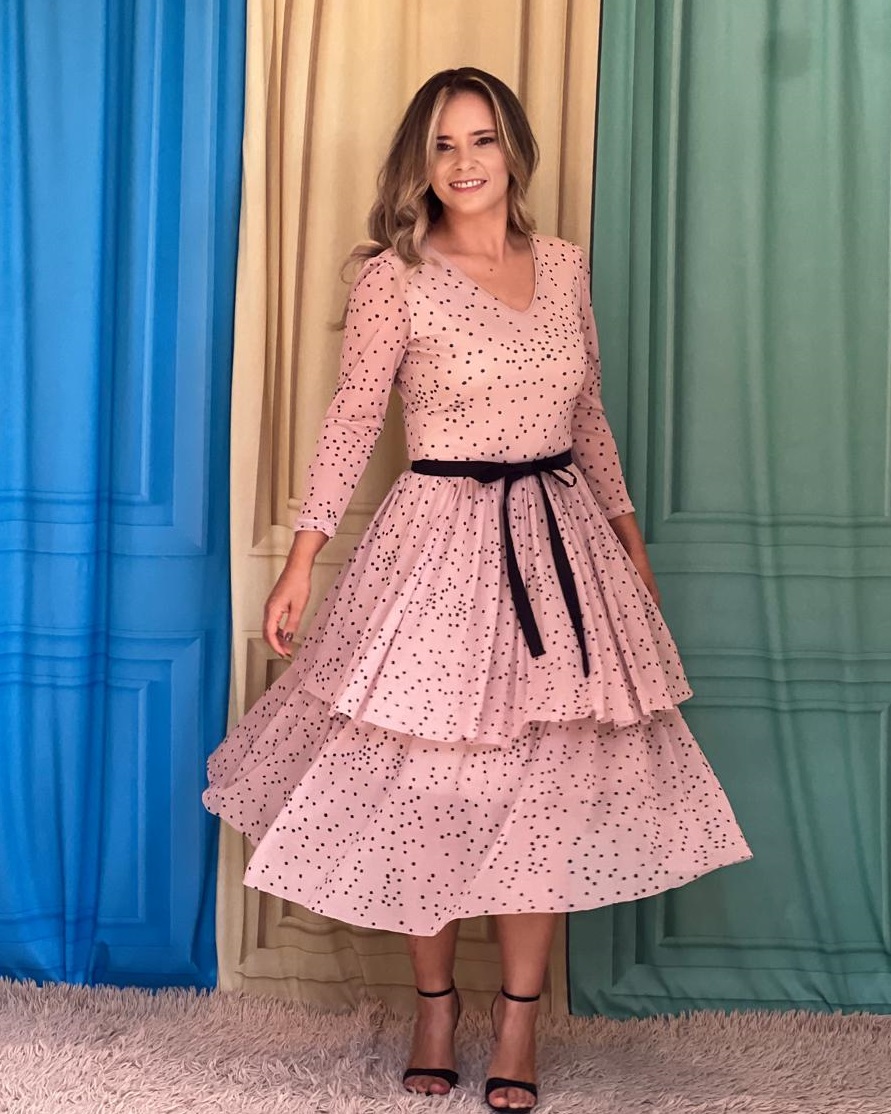 Vestido Alice no tule de poa bem princesa, com saia de camadas, bastante elastano , mangas3/4 e cintura marcada com faixa preta trazendo contraste fazendo uma cintura!!