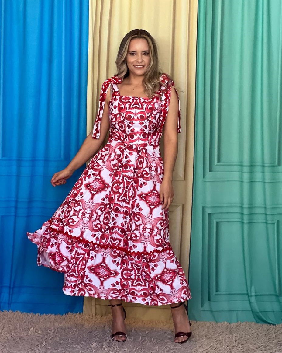 Vestido no crepe envolve sarjado forrado, costas de lastex, alças de amarrar, com detalhe de sianinha trazendo charme e elegancia