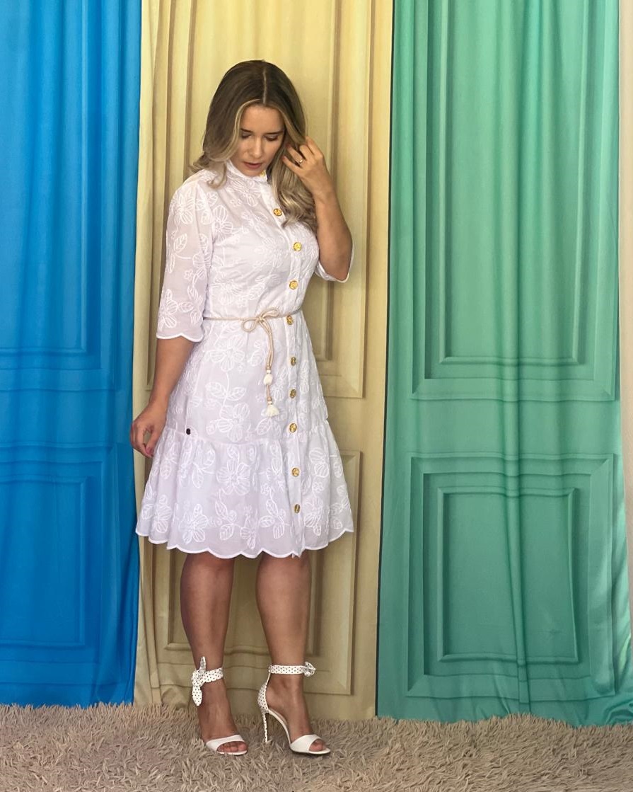 vestido na laise, com abertura frontal, manga 3/4 e faixa de amrrar na cintura, vestido levemente solto ao corpo com barra franzida de babado!Ele vai com cinto e veste a parte!