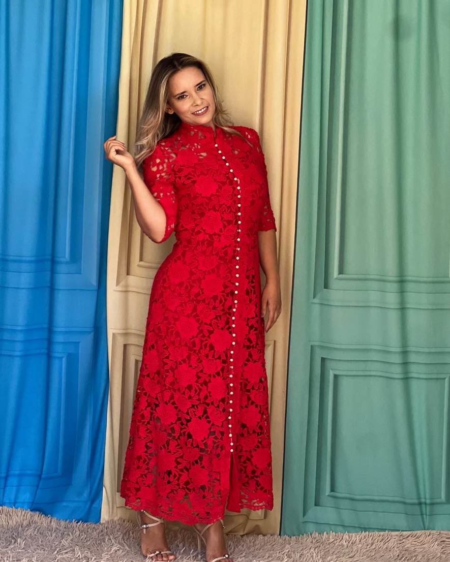 Vestido no guipir com veste de usar a parte, com acabamento no tricoline, e babado de bicos no tricoline, com botoes dourados trazendo destaque a peça!