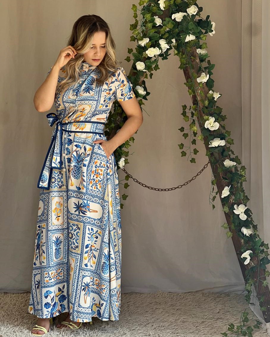 Vestido Marielle longo com botoes frontais e manga curta, bolsos nas laterais com faixa de amarrar com contorno de viez!