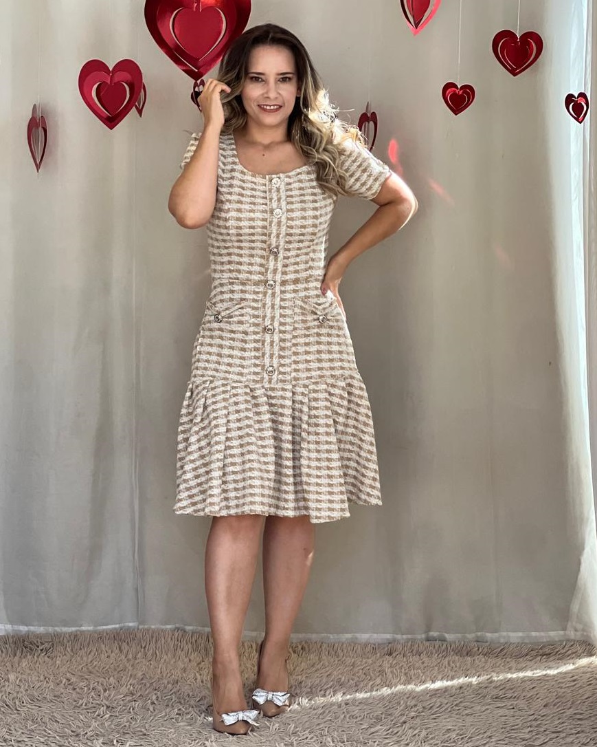 DESCRIÇÃO:Vestido na malha tweed bastante elastano com bolsos frontais fazendo um laço com botoes na frente ( nao sao funcionais) com babado na barra!Vestido belissimo com fios de lurex dourados e manga bufante!