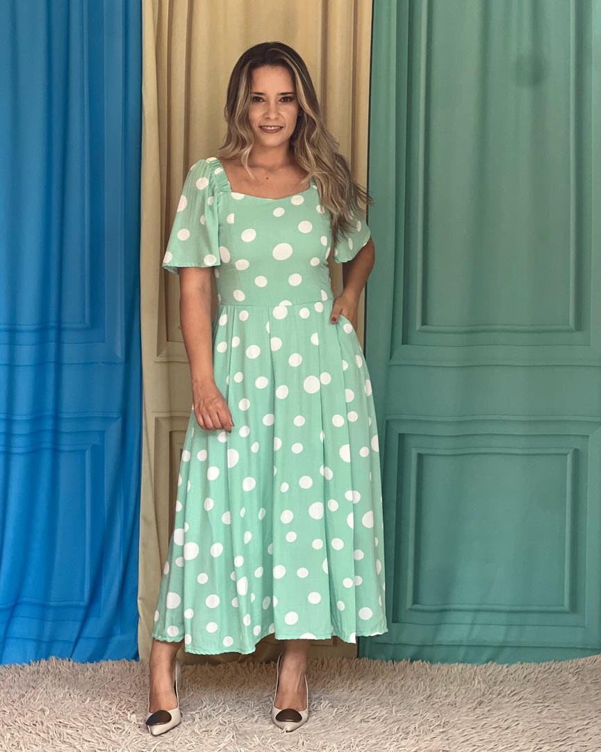 Vestido Suzana no viscolinho, com a estampa do momento, poa de varios tamanhos, costas de lastex, midi, com bolsos laterais!