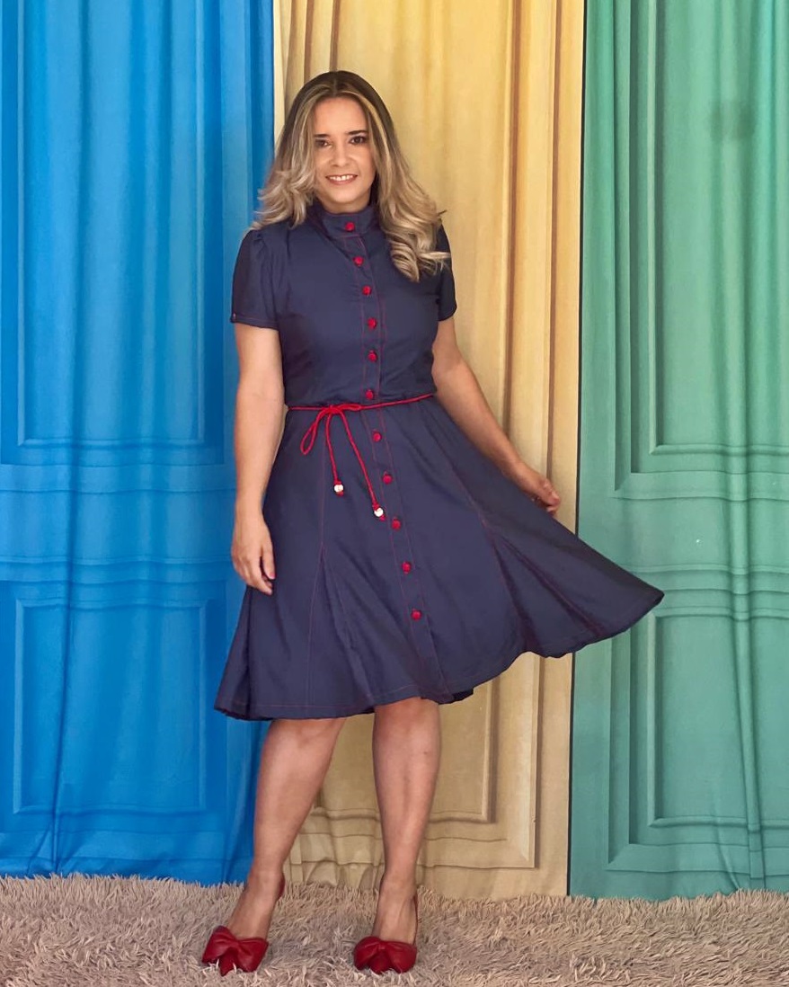 Vestido Taiamara no jeans tencel, leve com caimento mravilhosos, todo pespontado no vermelho, com botoes forrados a mão tambem no vermelho, com cinto corda de amarrar na cinturaa!Abertura frontal, com modelgame de camisa com a saia abrindoembaixo com nesgas trazendo leveza e volume na barra!