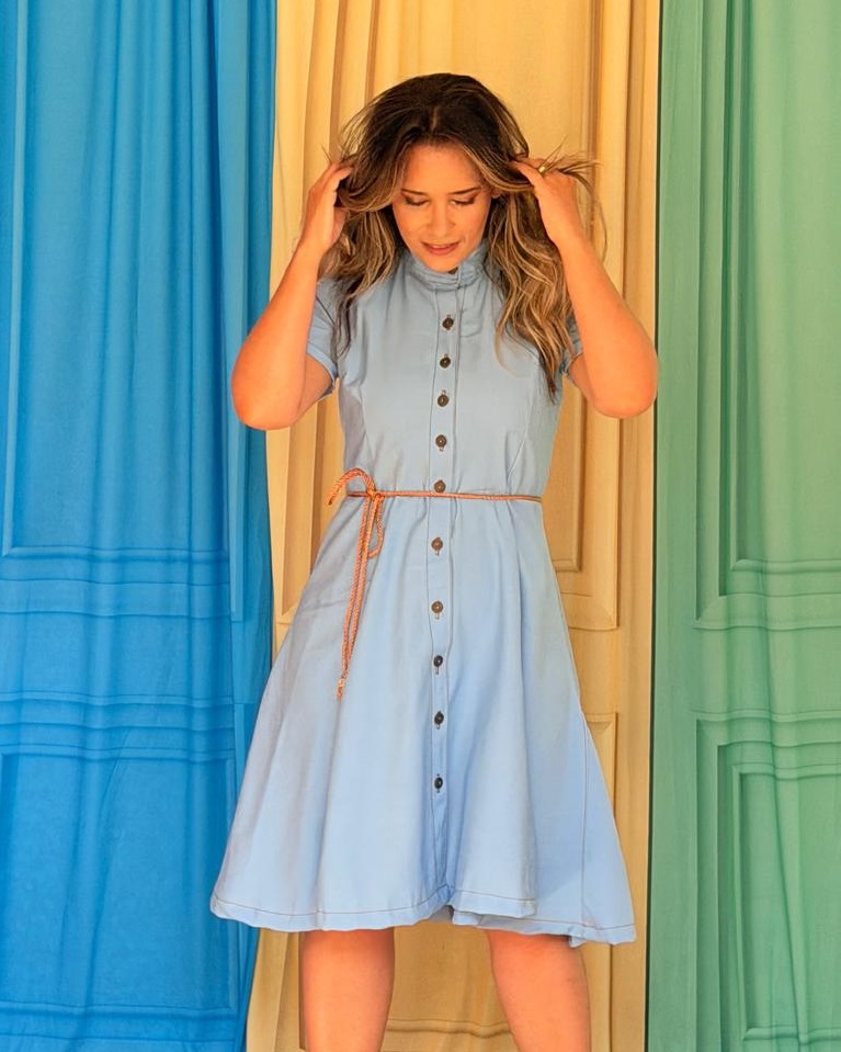 Vestido Taiamara no jeans tencel, leve com caimento mravilhosos, todo pespontado no vermelho, com botoes forrados a mão tambem no vermelho, com cinto corda de amarrar na cinturaa!Abertura frontal, com modelgame de camisa com a saia abrindoembaixo com nesgas trazendo leveza e volume na barra!