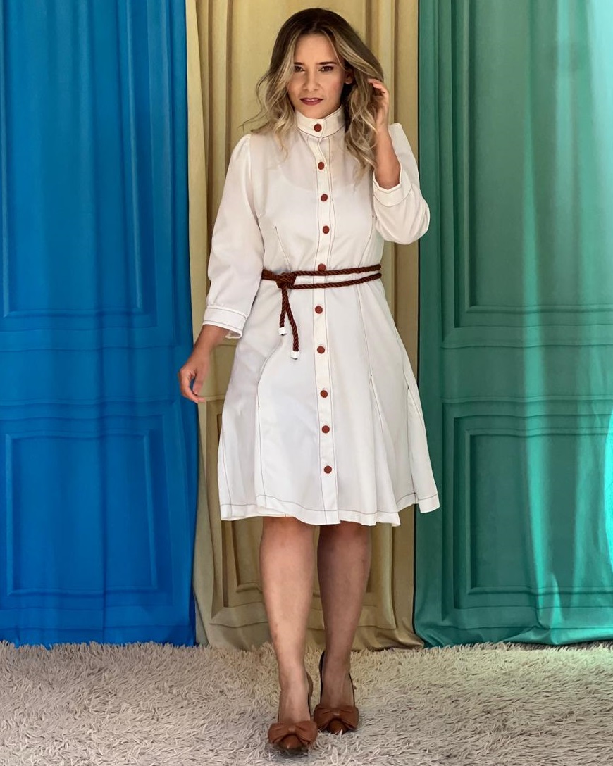 Vestido Taiamara no jeans tencel, leve com caimento mravilhosos, todo pespontado no marrom, com botoes forrados a mão tambem no , com cinto corda de amarrar na cinturaa!Abertura frontal, com modelgame de camisa com a saia abrindo embaixo com nesgas trazendo leveza e volume na barra!Vai com veste a parte