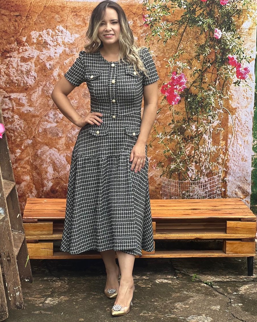 Vestido Welida no tweed com elatano , tecido texturizado , com botoes frontais com abotoadura nas costas trazendo conforto na hora de vestir, comprimento maxi midi, modelagem perfeita!